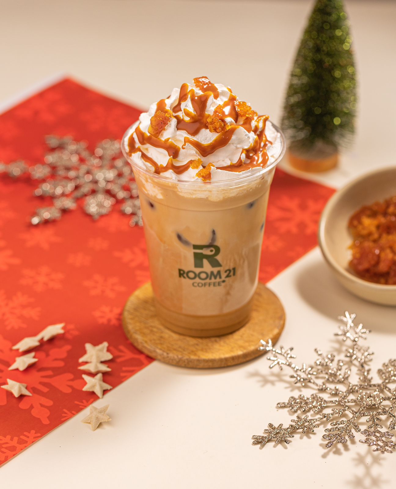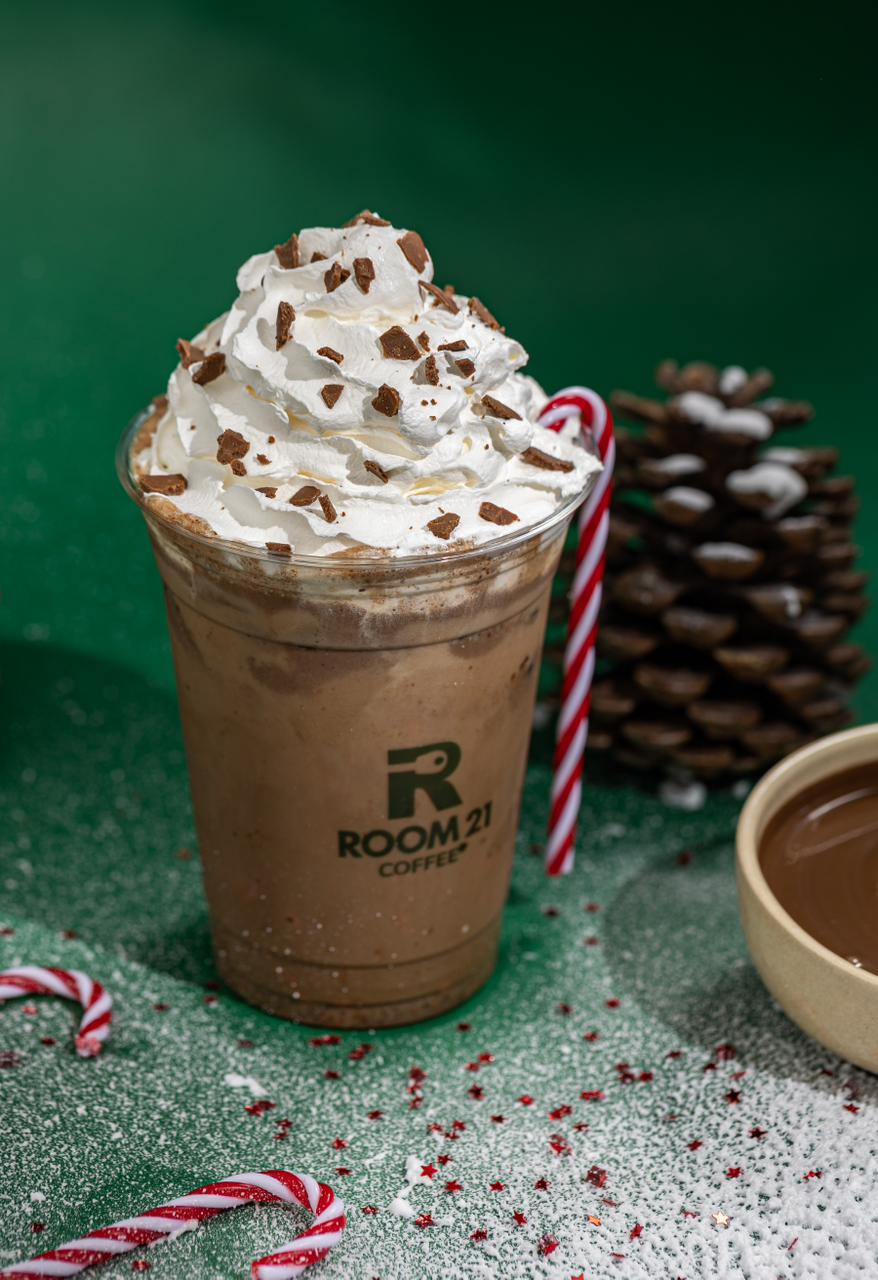 A preparation made with salted caramel and vanilla, and a rich espresso flavor. All topped with whipped cream and pieces of caramel shards.