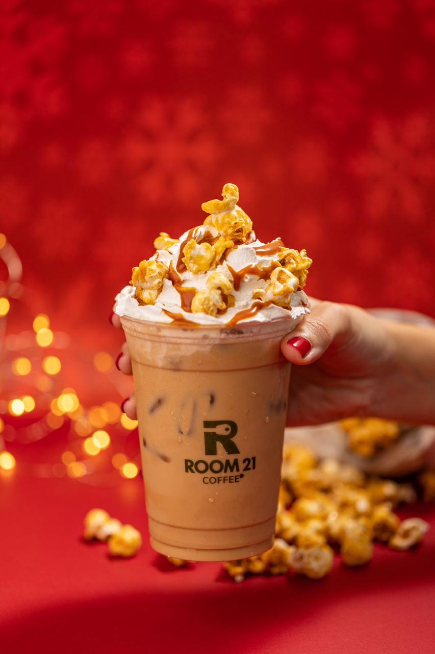 Delicious drink with a rich flavor of popcorn, espresso, and salted caramel. Topped with whipped cream, caramel sauce, and caramelized popcorn.